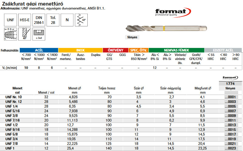 UNF-3/4"-16 HSSE(HSSCo) DIN 2184-1 Tűrésmező:2B